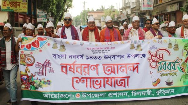 হাবিবুর রহমান, চিলমারী (কুড়িগ্রাম) প্রতিনিধিঃ কুড়িগ্রামের চিলমারীতে নানা আয়োজনের মধ্য দিয়ে “বাংলা নববর্ষ-১৪৩৩ উদযাপন উপলক্ষে আনন্দ ও শোভাযাত্রা অনুষ্ঠিত হয়েছে। পহেলা বৈশাখের প্রথম প্রহরেই প্রাণের উচ্ছ্বাস নিয়ে, সকাল ৯টায় উপজেলা প্রশাসনের উদ্যোগে একটি বর্ষবরণ আনন্দ ও শোভাযাত্রা রেলি বের হয়ে, উপজেলার প্রধান প্রধান সড়ক গুলো প্রদক্ষিণ শেষ উপজেলায় এসে শেষ করেন। এরপরে উপজেলা পরিষদ অডিটোরিয়াম কক্ষে “পান্তা উৎসবের” আয়োজন করা হয়েছে। উপজেলা পরিষদ চত্বরের মুক্তমঞ্চে উপজেলা শিল্পকলা একাডেমির আয়োজনে, সাংস্কৃতিক অনুষ্ঠান অনুষ্ঠিত হয়েছে। এবং দিনব্যাপী বৈশাখী মেলা অনুষ্ঠিত হয়েছে। এ সময় উপস্থিত ছিলেন, উপজেলা নির্বাহী অফিসার মাহমুদুল হাসান, উপজেলা কৃষি অফিসার কনক চন্দ্র রায়, উপজেলা বিএনপির আহ্বায়ক আলহাজ্জ আঃ বারী সরকার, সদস্য সচিব সহকারী অধ্যাপক আবু হানিফা, যুগ্ম আহ্বায়ক ফজলুল হকসহ বিভিন্ন শিক্ষা প্রতিষ্ঠান প্রধান, শিক্ষার্থী, সাংস্কৃতিক কর্মী ও বিভিন্ন শ্রেণীর পেশার মানুষেরা উপস্থিত ছিলেন।