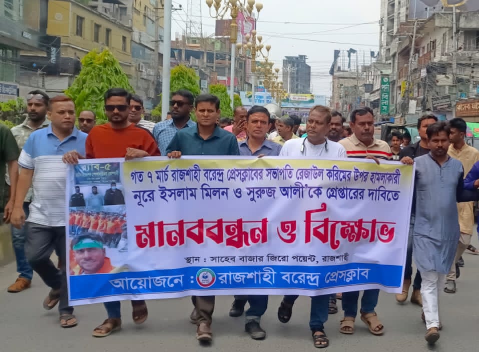 রাজশাহীতে বরেন্দ্র প্রেসক্লাবের মানববন্ধন