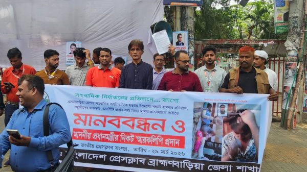 জাহাঙ্গীর আলম জেলা প্রতিনিধি ব্রাহ্মণবাড়িয়া আজ ২৯.০৩.২০২৬ ইং, রোববার সকাল ১১ ঘটিকায় রাজধানীর জাতীয় প্রেসক্লাবের সামনে বাংলাদেশ প্রেসক্লাব ব্রাহ্মণবাড়িয়া জেলা শাখা ও কেন্দ্রীয় কমিটির উদ্যোগে এক বিশাল মানববন্ধন ও বিক্ষোভ